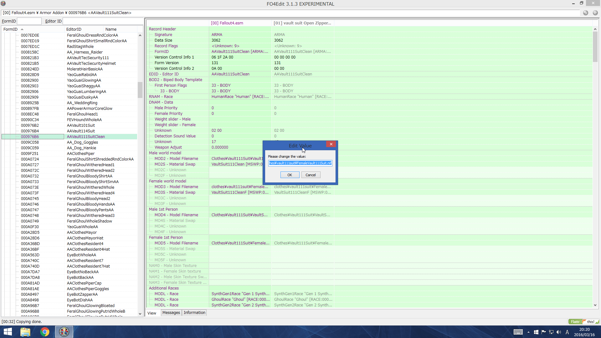 Armor Addon 内の名前は AAvault111Suit-New なので
